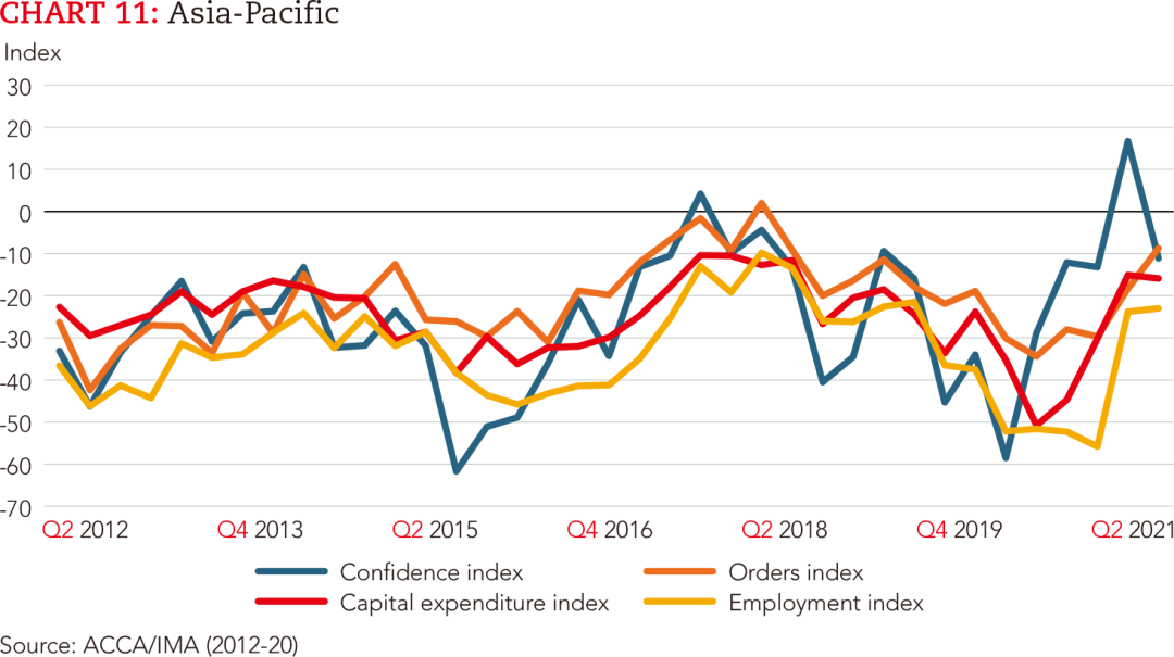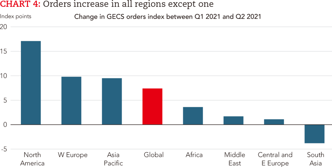 亚太地区整体信心下降、订单上升,而中国的情形恰恰相反。信心方面或许受到部分国家新冠疫情感染人数上升的影响。亚太地区的出口状况呈现健康的增长态势,与全球经济强劲复苏保持一致。调研显示,未来几个月这一趋势将继续下去,订单指数将达到三年来的高点。