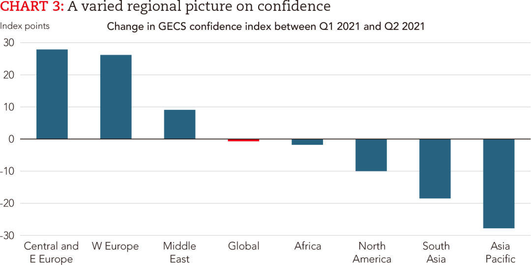 北美地区在这方面有所下降,不过在此前的一季度调研中,信心指数曾出现较大幅度增长。发达经济体目前逐渐复苏,主要受益于疫苗接种的快速推进和累积储蓄的支出等。