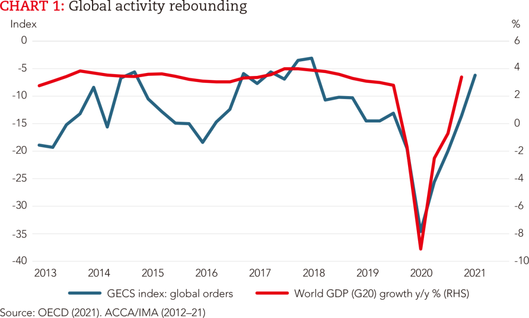 美国管理会计师协会(IMA)研究和政策副总裁瑞夫·劳森(Raef Lawson,博士、CMA、CPA)表示,全球国内生产总值(GDP)增速有望在2021年接近6%,相比2020年下降3.5%的萎靡表现,实现了极为强劲的反弹。许多发达经济体将实现GDP增长——得益于较高的疫苗接种率,发达经济体得以放松社交距离限制措施,经济发展也走上了正常轨道。