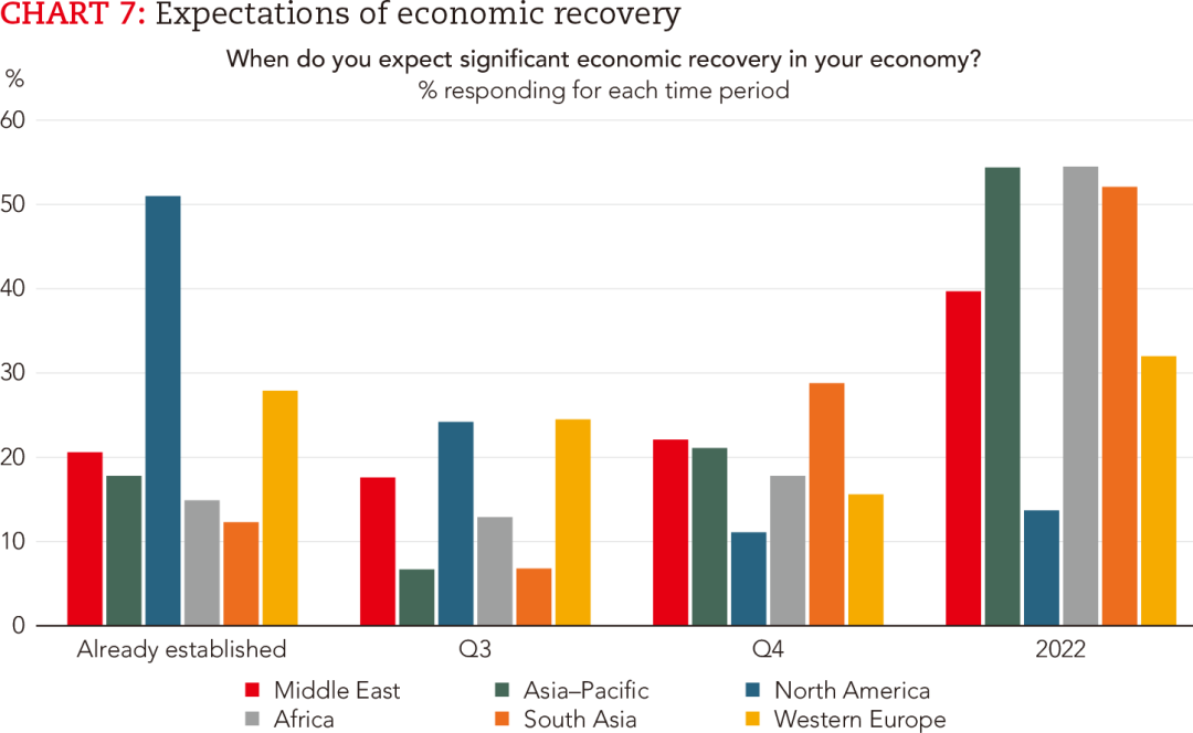 北美地区大多数受访者表示,经济复苏已经开始。相比之下,非洲和南亚地区超过一半的受访者预计经济情况最早要到2022年才会有所好转。亚太地区持同样观点,这令人颇感意外。在西欧,预计经济复苏有所延迟的受访者比例在一、二季度的两次调研中下降了10个百分点,表明该地区经济前景近期有所改善。